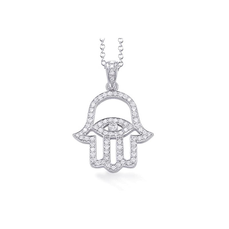 14 karat white gold polish-finish hand of god chamsa pendant centered with the evil eye motif and enhanced with 0 60 carat of pave set diamonds 20hx18w mm