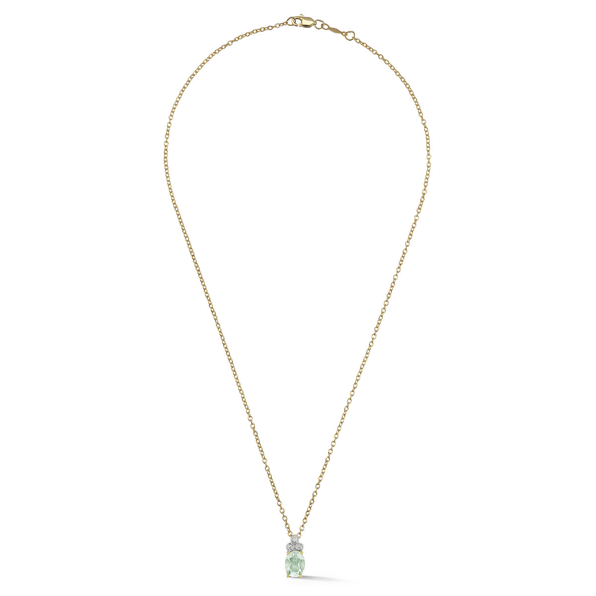 14 karat yellow gold polish-finished pendant, centered with 1.1ct of an 8x6mm oval-shaped checkerboard-cut green amethyst semi-precious color stone, accented with 0.045 carats of 3 bezel set diamonds, sliding on a 16" rolo chain