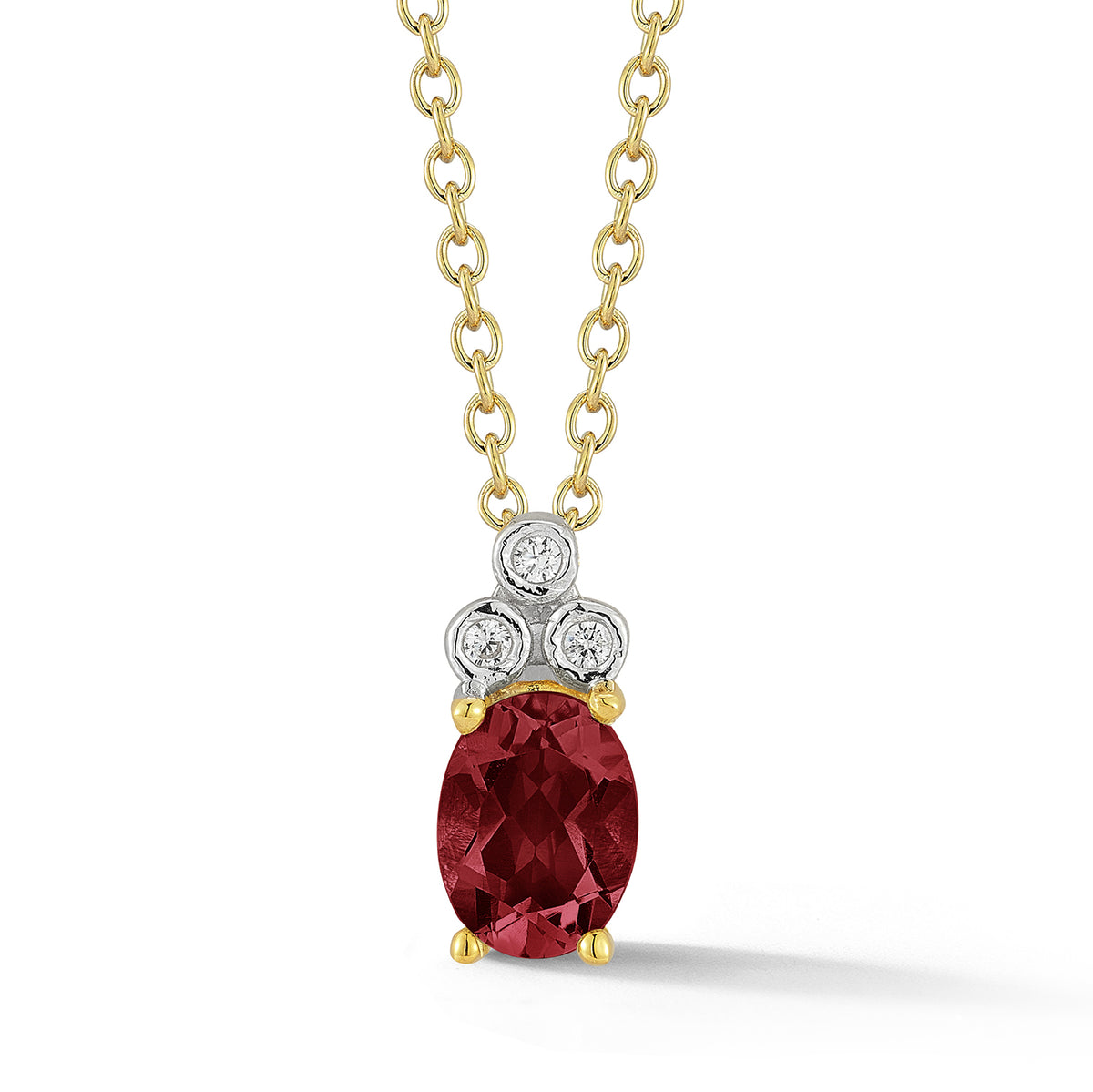 14 karat yellow gold polish-finished pendant, centered with 1.66ct of an 8x6mm oval-shaped checkerboard-cut garnet semi-precious color stone, accented with 0.045 carats of 3 bezel set diamonds, sliding on a 16" rolo chain