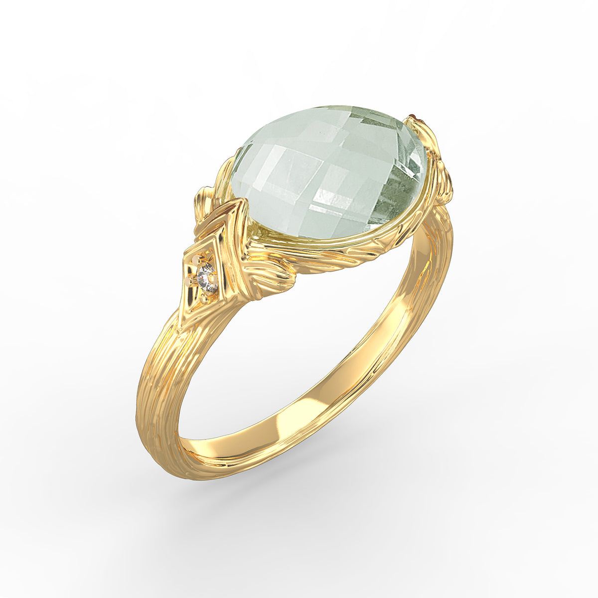 14 karat yellow gold etched and polish-finished cocktail ring, centered with an 8x10mm oval-shaped checkerboard-cut 2.45ct green amethyst semi-precious color stone, accented with 0.05 carats of bezel set diamonds