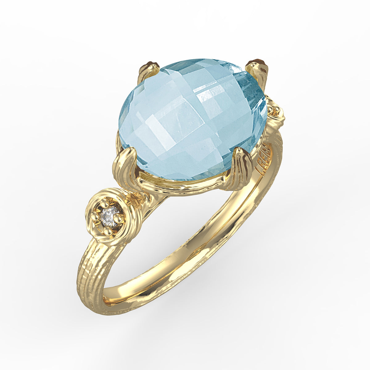 14 karat yellow gold etched and polish-finished cocktail ring, centered with an 10x8mm oval-shaped faceted 3.3ct blue topaz semi-precious color stone, accented with 0.05 carats of bezel set diamonds