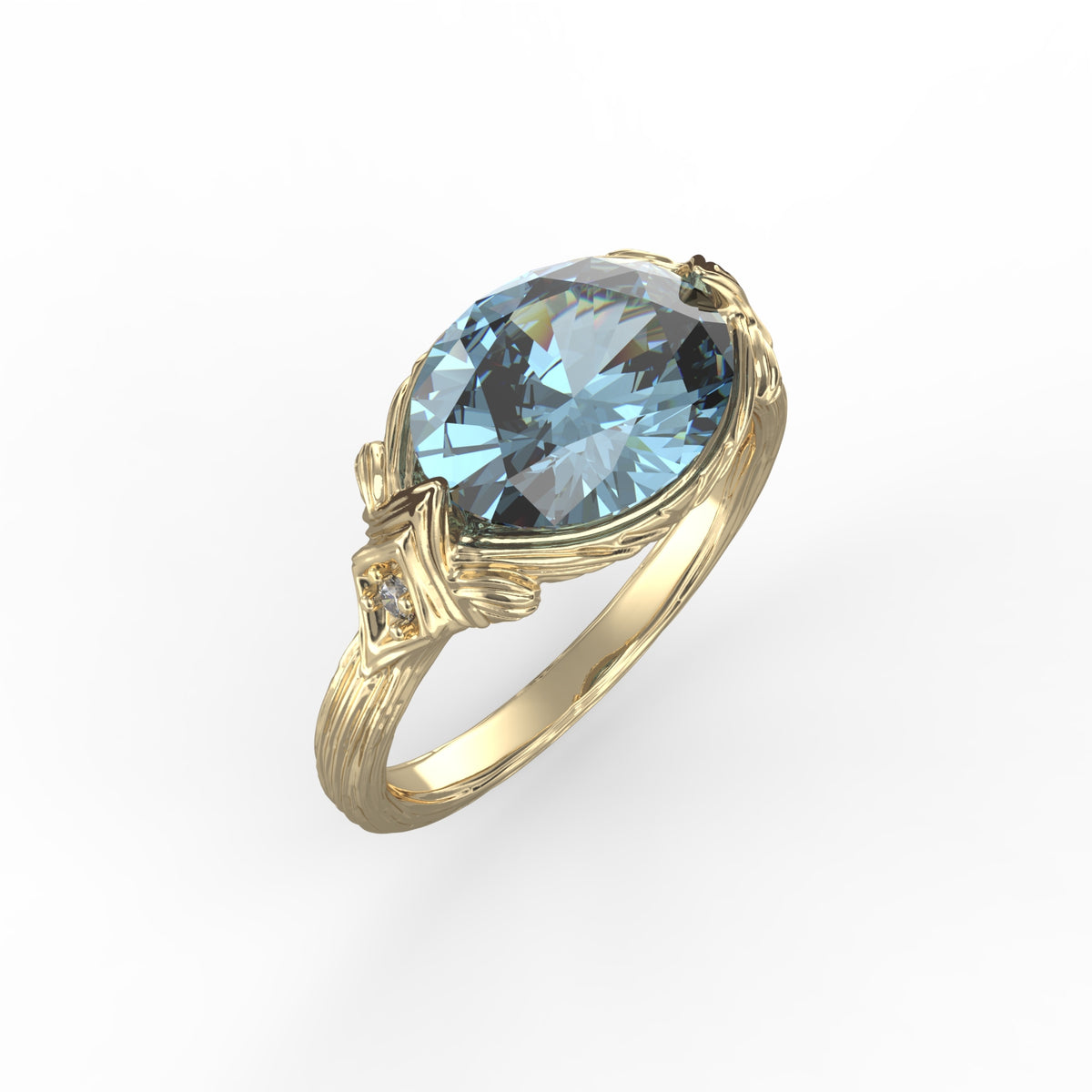14 karat yellow gold etched and polish-finished cocktail ring, centered with an 8x10mm oval-shaped checkerboard-cut 3.3ct blue topaz semi-precious color stone, accented with 0.05 carats of bezel set diamonds