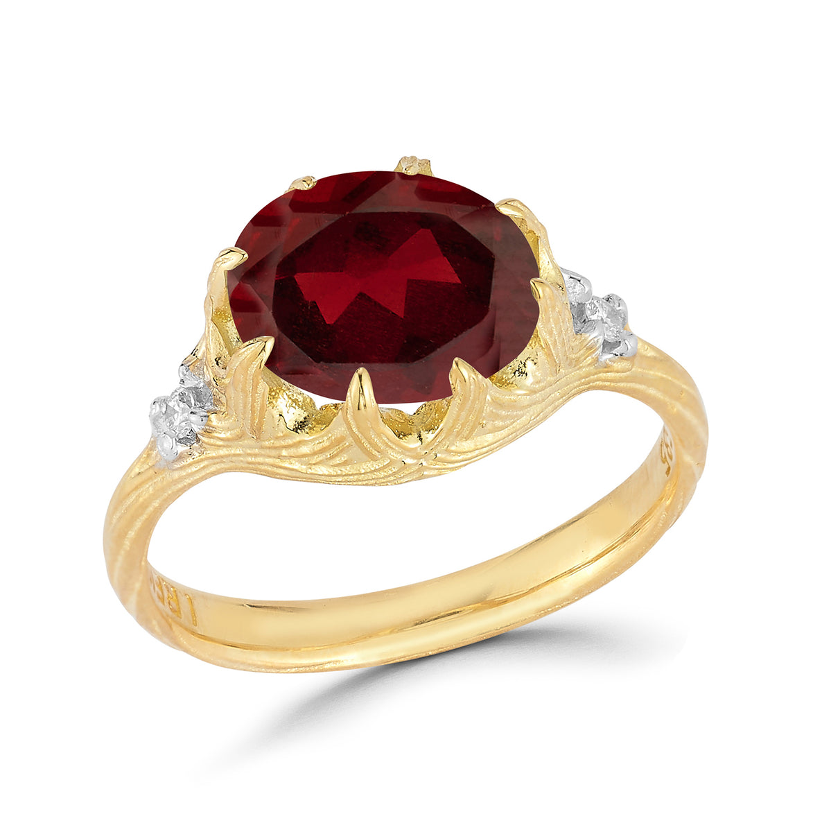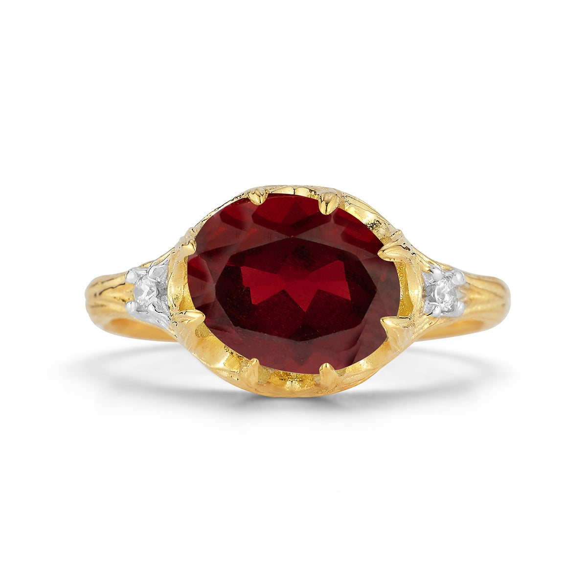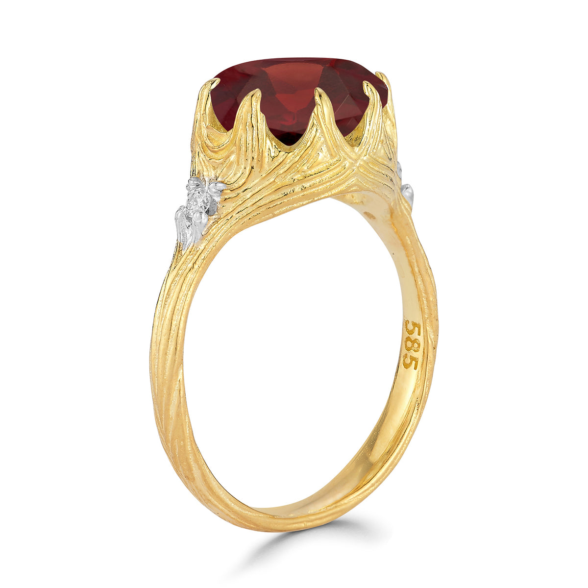 14 karat yellow gold etched and polish-finished cocktail ring, centered with a 10mm round faceted 4.9ct garnet semi-precious color stone, accented with 0.05 carats of bezel set diamonds