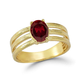 14 karat yellow gold polish-finished cocktail ring, centered with a 8x6mm checkerboard-cut oval-shaped 1.66ct garnet semi-precious color stone, and accented with 0.09 carats of bezel set diamonds