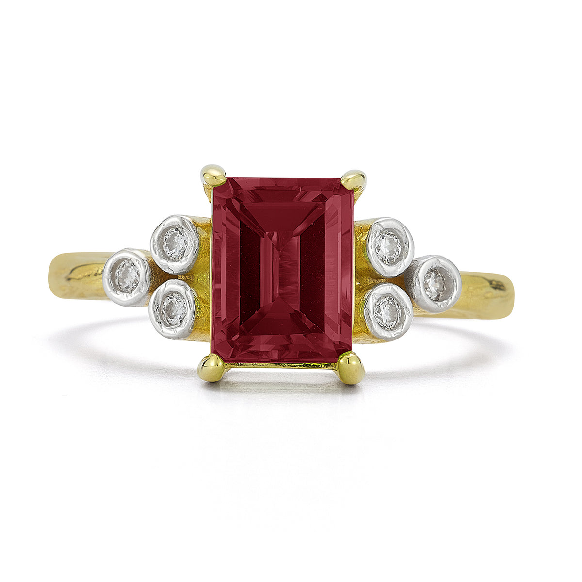 14 karat yellow gold polish-finished cocktail ring, centered with an 8x6mm rectangular-shaped octagon-cut 2.5ct garnet semi-precious color stone, and accented with 0.09 carats of bezel set diamonds