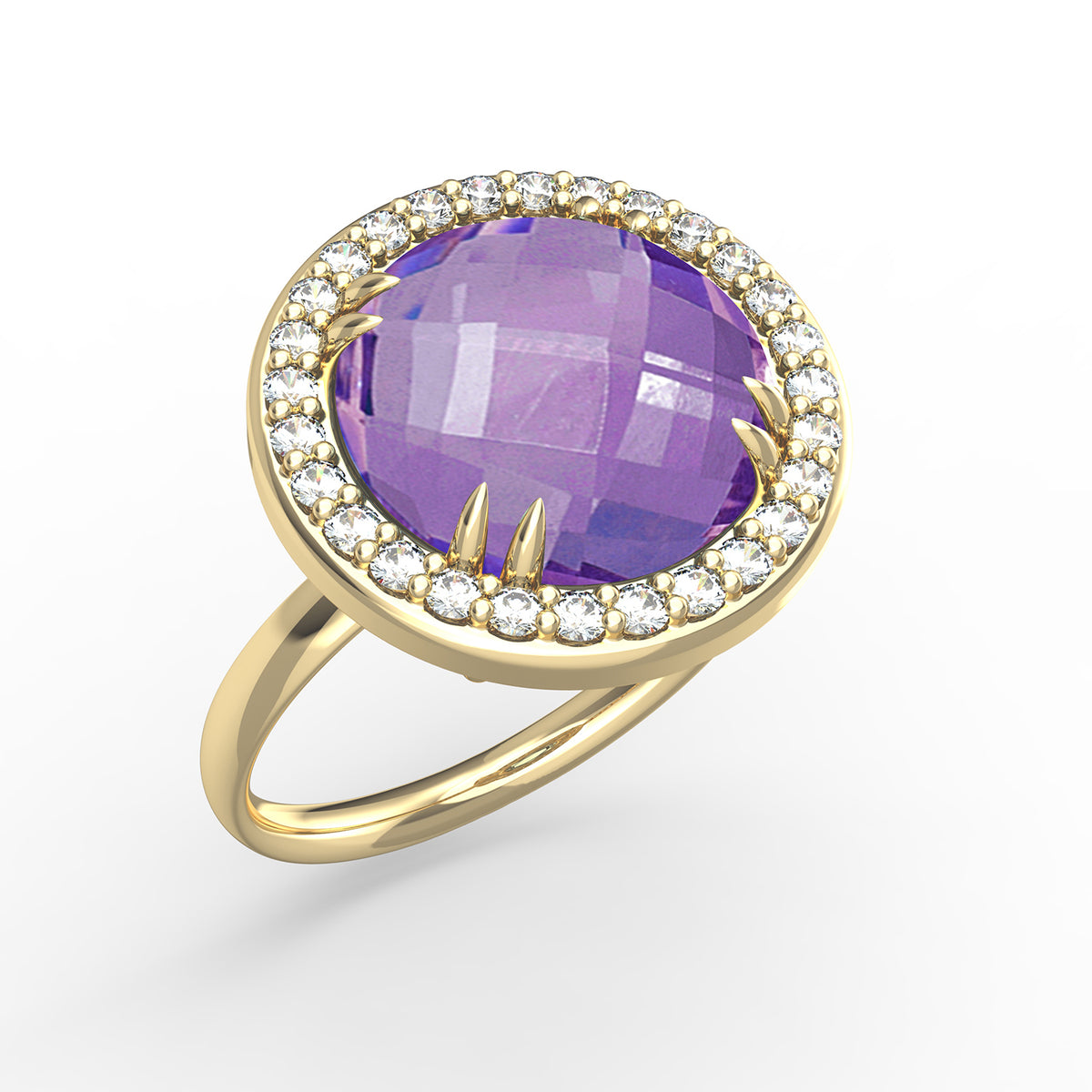 14 karat yellow gold polish-finished cocktail ring, centered with a 10mm round checkerboard-cut 3.25ct amethyst semi-precious color stone, surrounded by 0.20 carats of pave set diamonds
