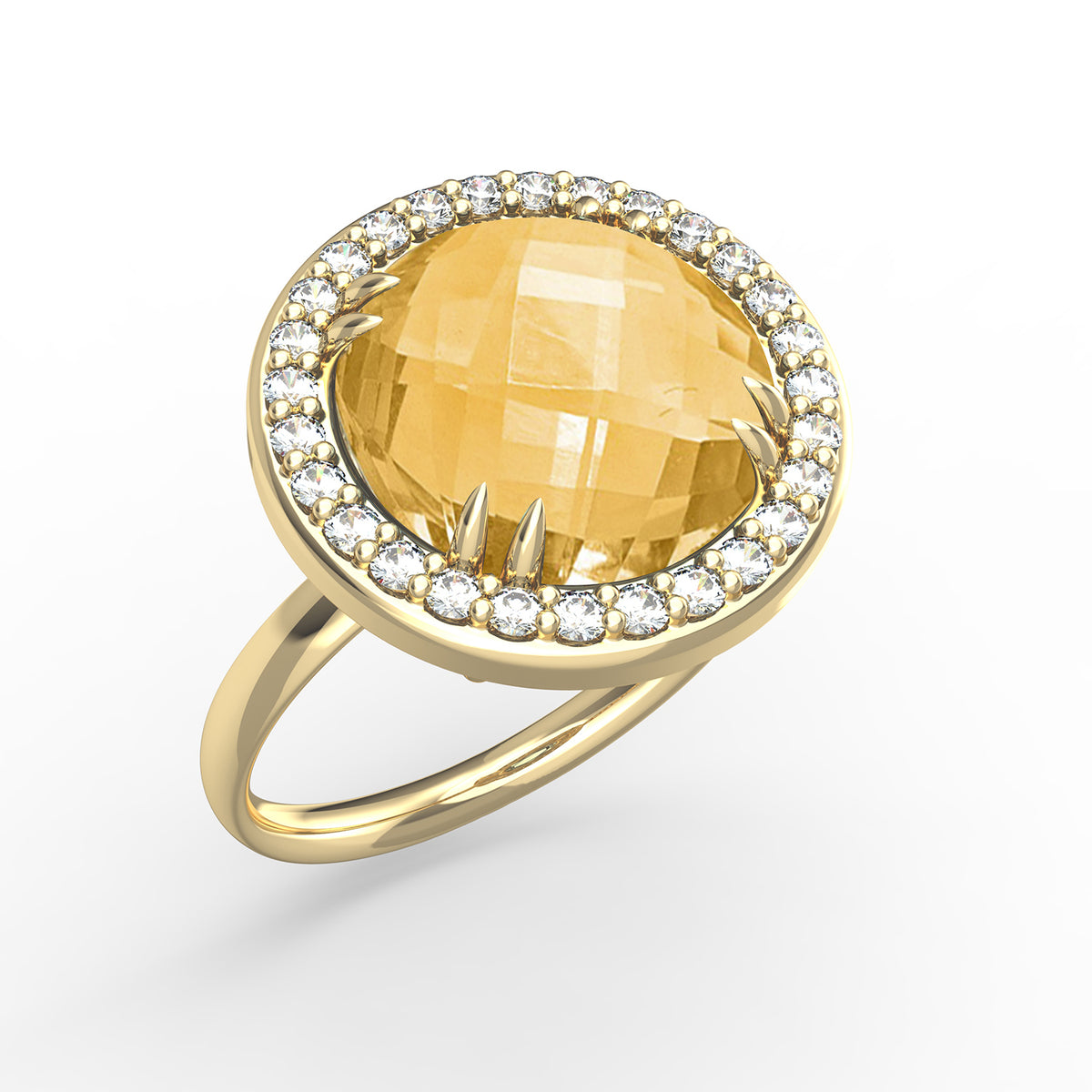 14 karat yellow gold polish-finished cocktail ring, centered with a 10mm round checkerboard-cut 3.35ct citrine semi-precious color stone, surrounded by 0.20 carats of pave set diamonds