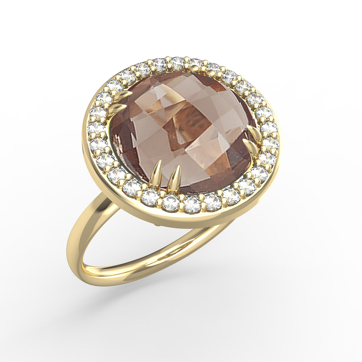 14 karat yellow gold polish-finished cocktail ring, centered with a 10mm round checkerboard-cut 3.5ct smokey topaz semi-precious color stone, surrounded by 0.20 carats of pave set diamonds