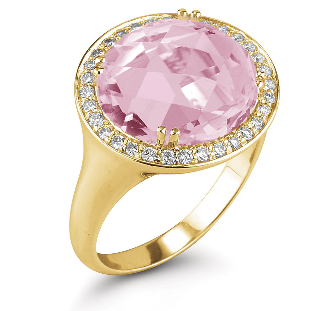 14 karat yellow gold polish-finished cocktail ring, centered with a 12mm 9.95ct rose quartz semi-precious color stone, surrounded with 0.43 carats of pave set diamonds