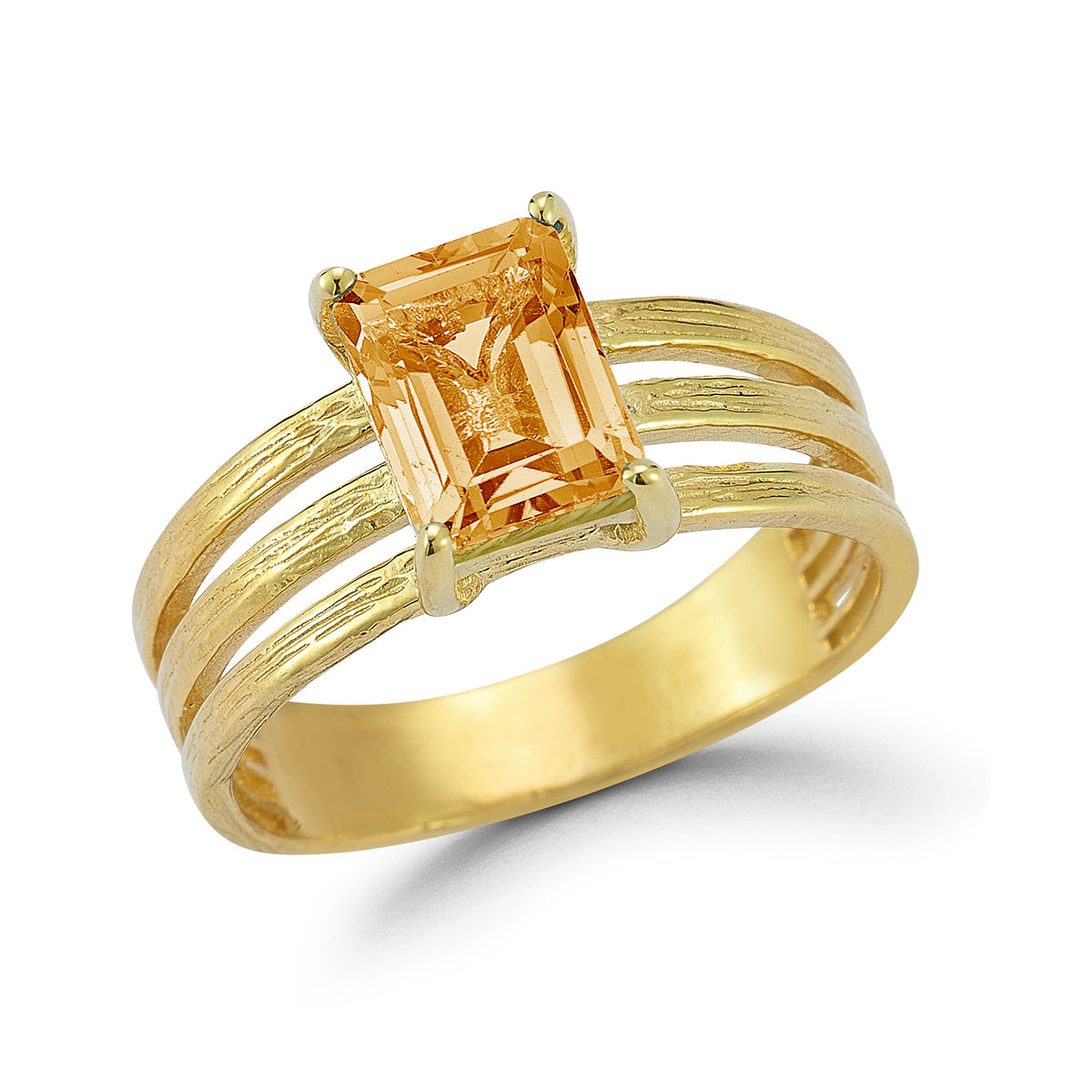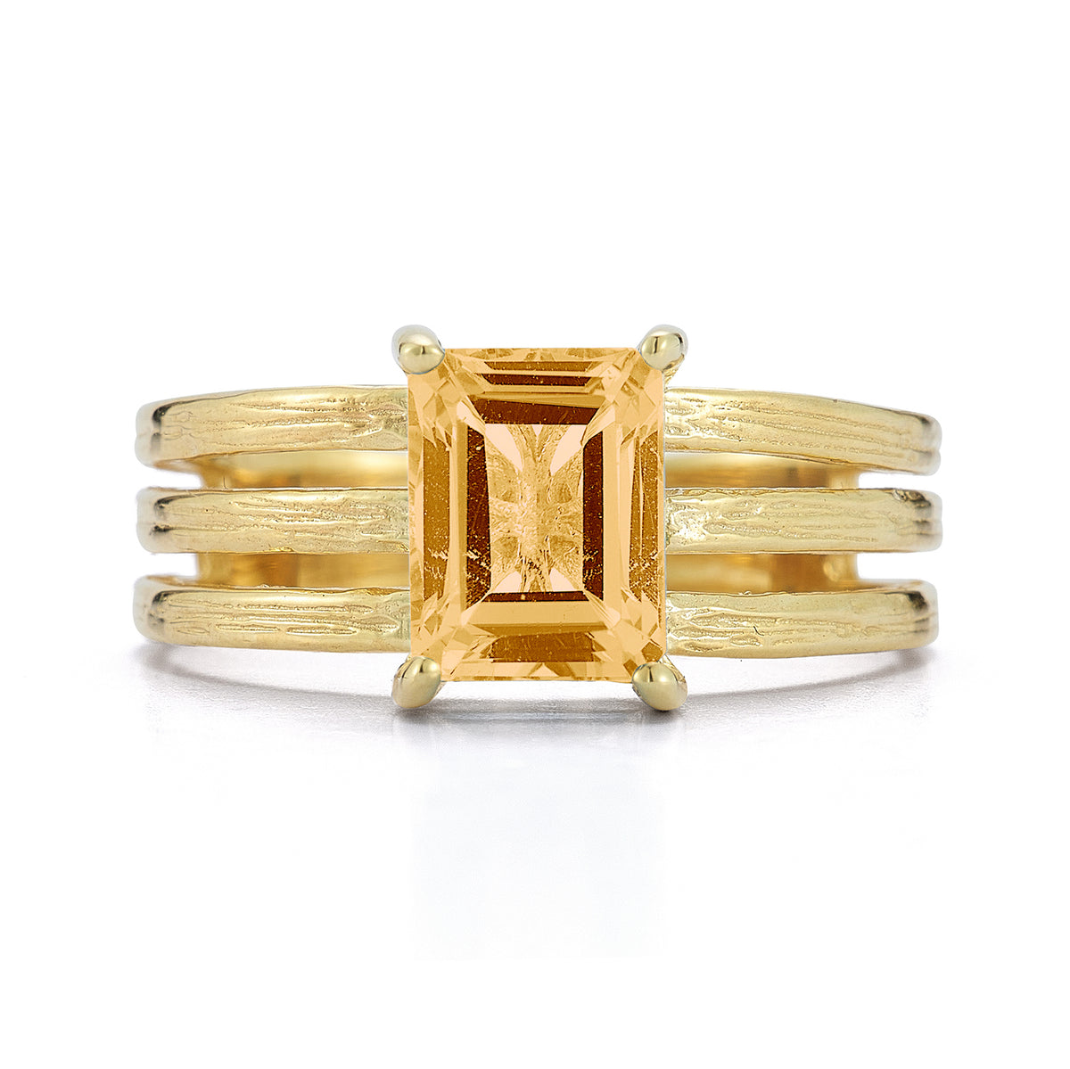 14 karat yellow gold mixed matte and polish-finished cut-out cocktail ring, centered with an 8x6mm octagon-cut rectangular-shaped 1.5ct citrine semi-precious color stone