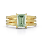 14 karat yellow gold mixed matte and polish-finished cut-out cocktail ring, centered with an 8x6mm octagon-cut rectangular-shaped 1.5ct green amethyst semi-precious color stone