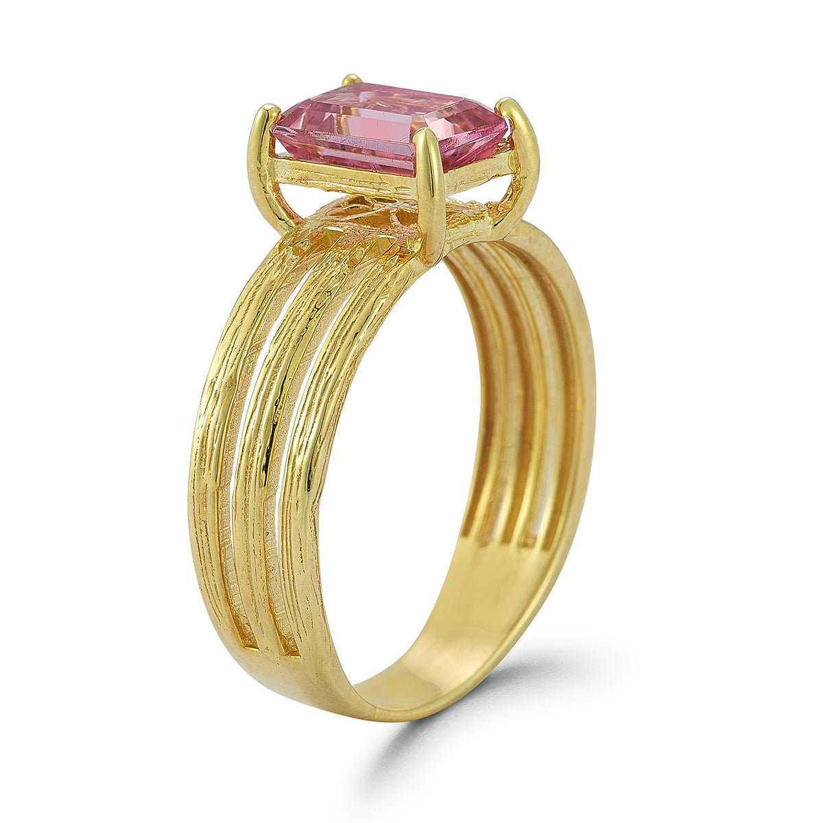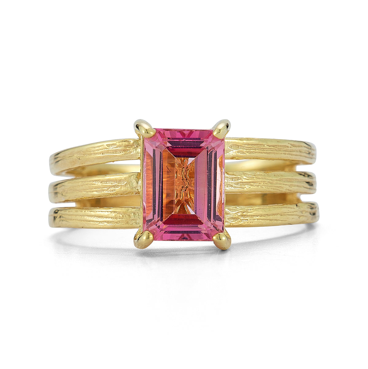 14 karat yellow gold mixed matte and polish-finished cut-out cocktail ring, centered with an 8x6mm octagon-cut rectangular-shaped 1.5ct pink tourmaline semi-precious color stone