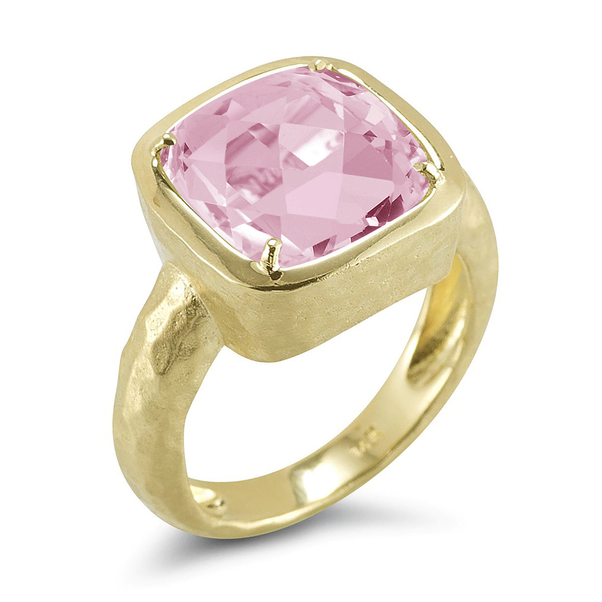 14 karat yellow gold matte and hammer-finished cocktail ring, centered with a 6.0ct 12mm cushion-cut rose quartz semi-precious color stone