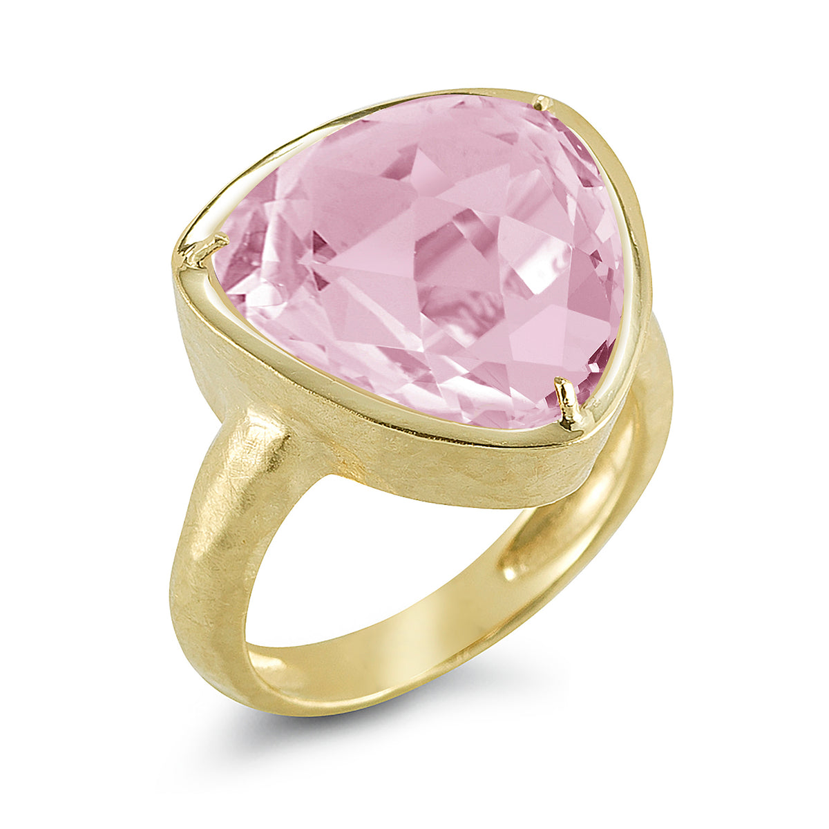 14 karat yellow gold matte and hammer-finished cocktail ring, set with a 15mm triangle-shaped checkerboard cut 9.2ct rose quartz semi-precious color stone.