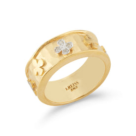 14 karat yellow gold matte and hammer-finished 8mm clover cuff bracelet accented with 0 12 carats of bezel set diamonds