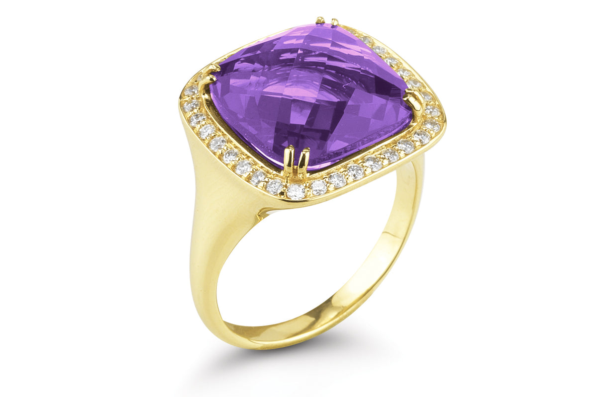 14 karat yellow gold polish-finish cocktail ring, centered with a 6.0ct 12mm checkerboard cushion-cut semi-precious amethyst color stone, surrounded by 0.43 carats of pave set diamonds