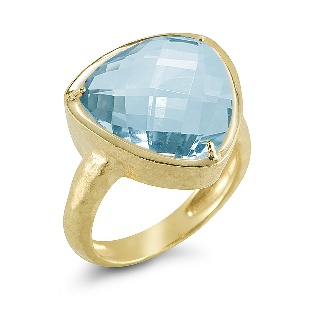 14 karat yellow gold matte and hammer-finished cocktail ring, set with a 15mm triangle-shaped checkerboard cut 12.25ct blue topaz semi-precious color stone.