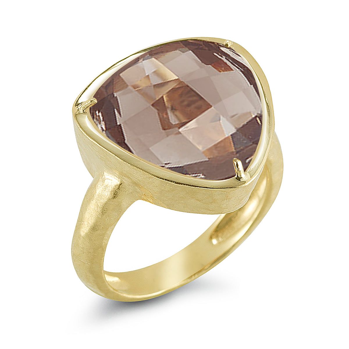 14 karat yellow gold matte and hammer-finished cocktail ring, set with a 15mm triangle-shaped checkerboard cut 9.7ct smokey topaz semi-precious color stone.
