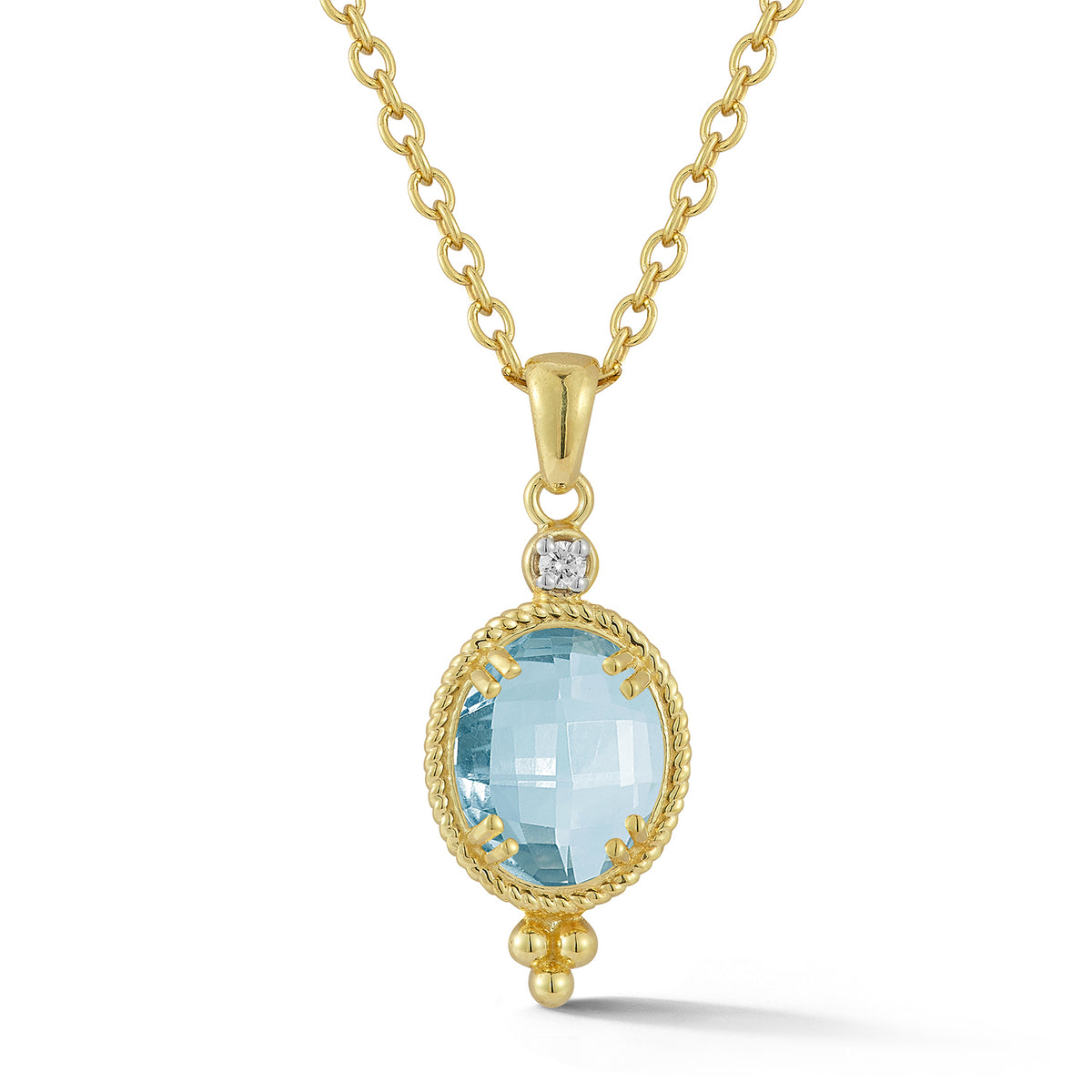 14 karat yellow gold polish-finished pendant, centered with an 8x10mm oval-shaped checkerboard-cut 3.3ct blue topaz semi-precious color stone surrounded by a rope embellishment, accented with 0.035 carats of a bezel set diamond, sliding on a 16" rolo chain