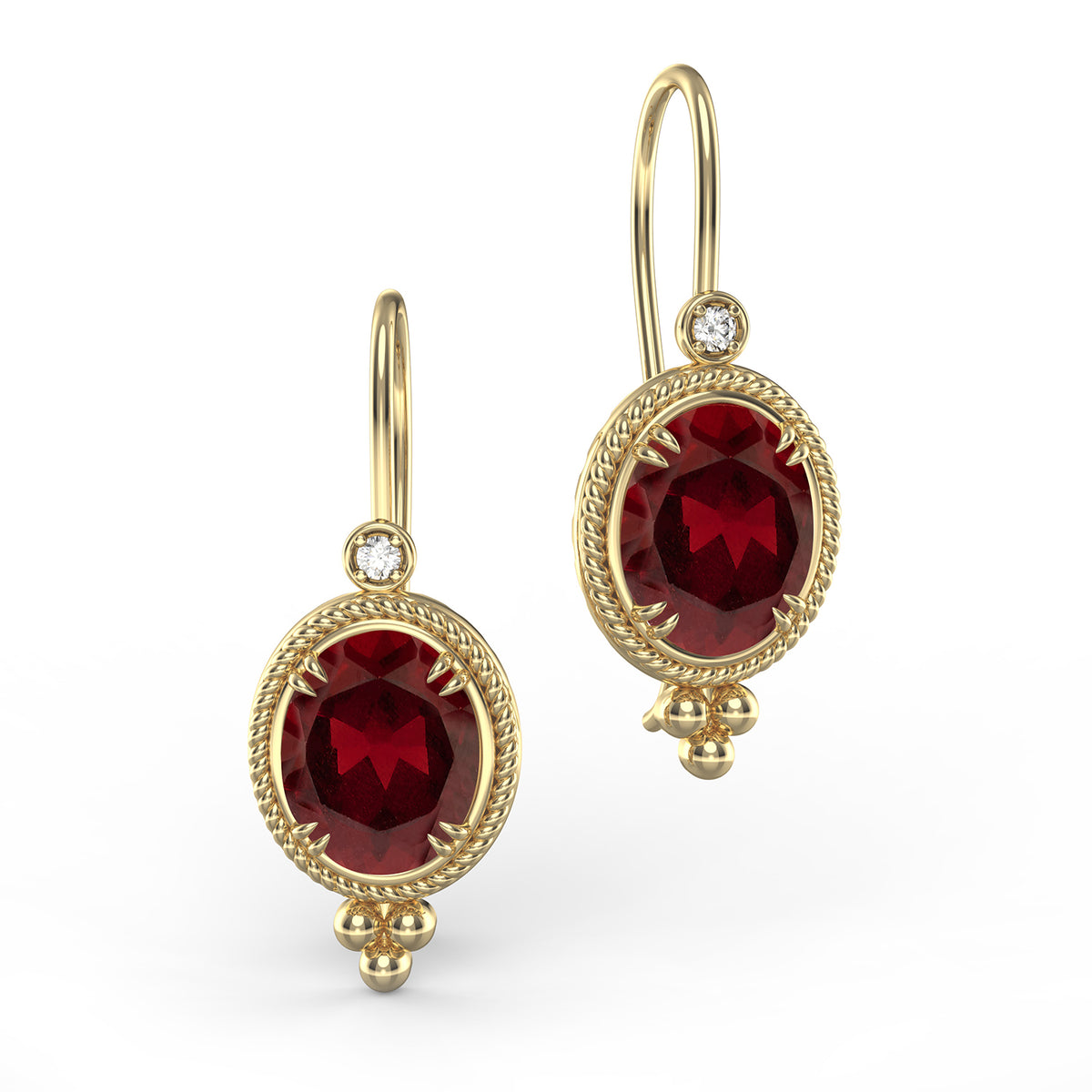 14 karat yellow gold polish-finished beaded drop earrings, set with an 8x10mm 7.0ct checkerboard cut oval-shaped garnet semi-precious color stones and accented with 0.07 carat diamonds