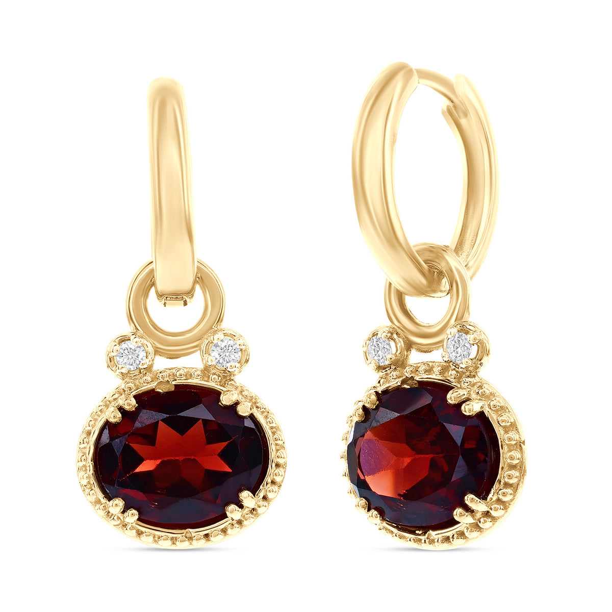 14 karat yellow gold polish-finished hoop earrings, set with a dangling 5ct 8x10mm checkerboard-cut oval-shaped garnet semi-precious color stones and accented with 0.10 carat diamonds