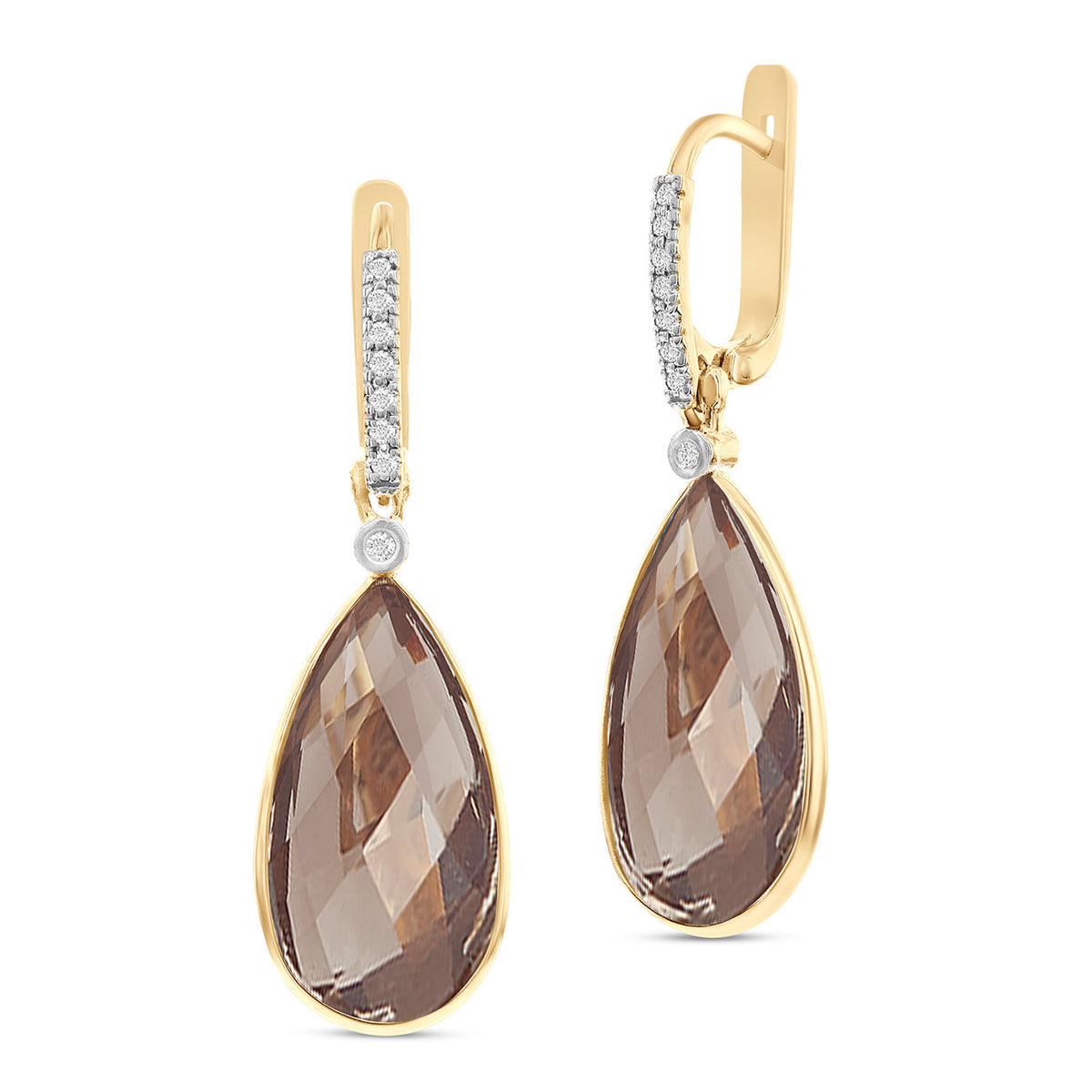14 karat yellow gold polish-finished dangling tear-drop earrings, set with checkerboard-cut smokey topaz semi-precious color stones and accented with 0.14 carat diamonds