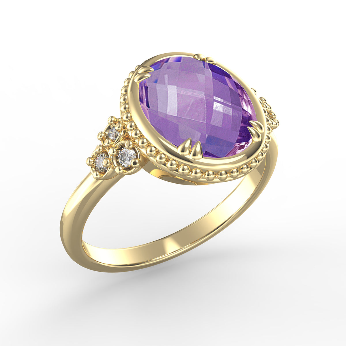 14 karat yellow gold polish-finished beaded cocktail ring, centered with a 8x10mm checkerboard-cut oval shaped 2.7ct amethyst semi-precious color stone, and accented with 0.15 carats of bezel set diamonds