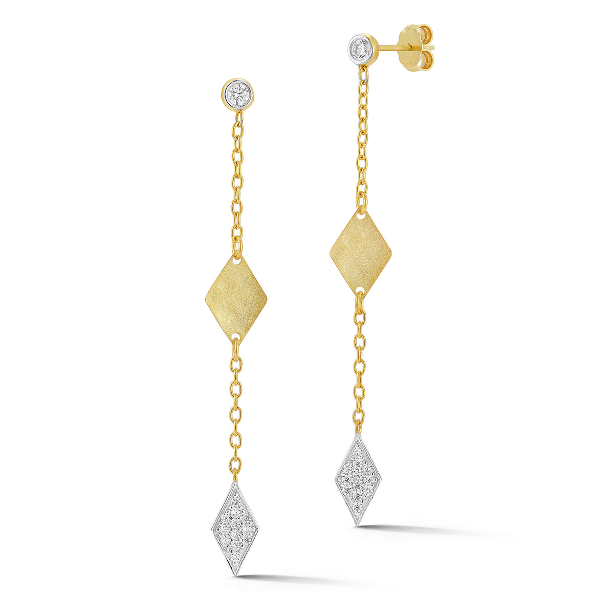 14 karat yellow gold mixed matte and polish-finished dangling gold and diamond earrings, accented with 0.20 carats of pave set diamonds