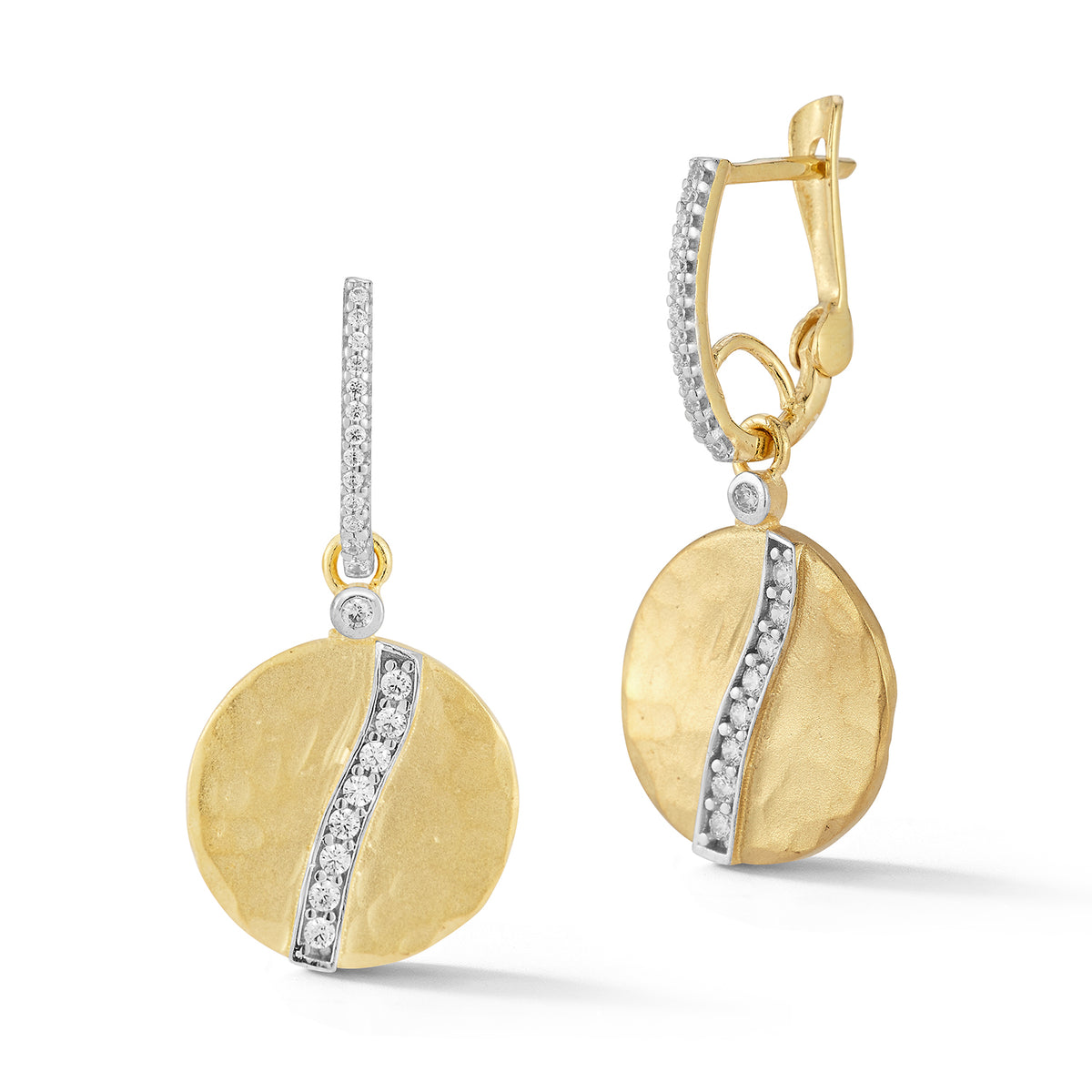 14 karat yellow gold matte and hammer-finished dangling earrings, accented with 0.36 carats of pave set diamonds