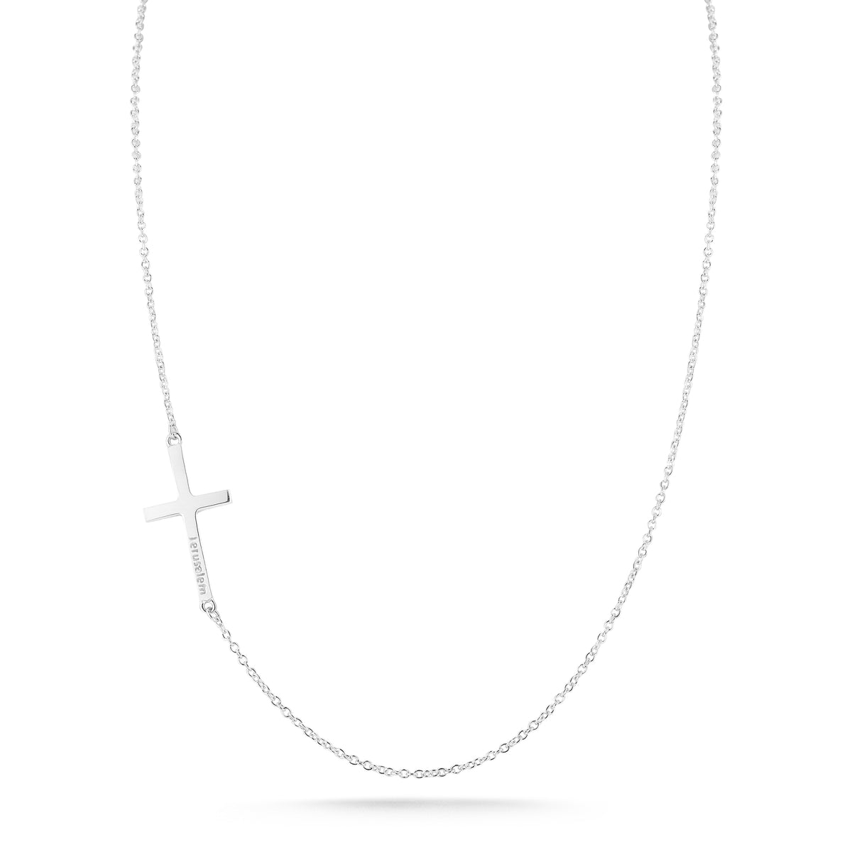 14 karat yellow gold polish-finish east-to-west cross necklace engraved with the jerusalem imprint on the back and accented with 0 25 carat of pave set diamonds