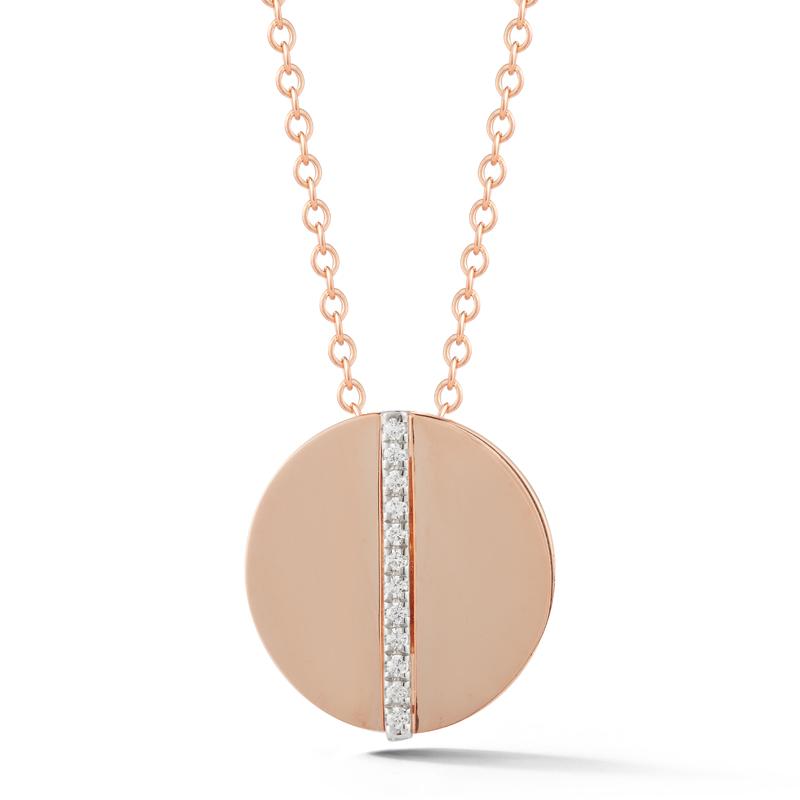 14 karat yellow gold polish-finished 20mm circle pendant accented with 0 10 carats of pave set diamonds sliding on a 16 rolo chain