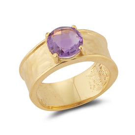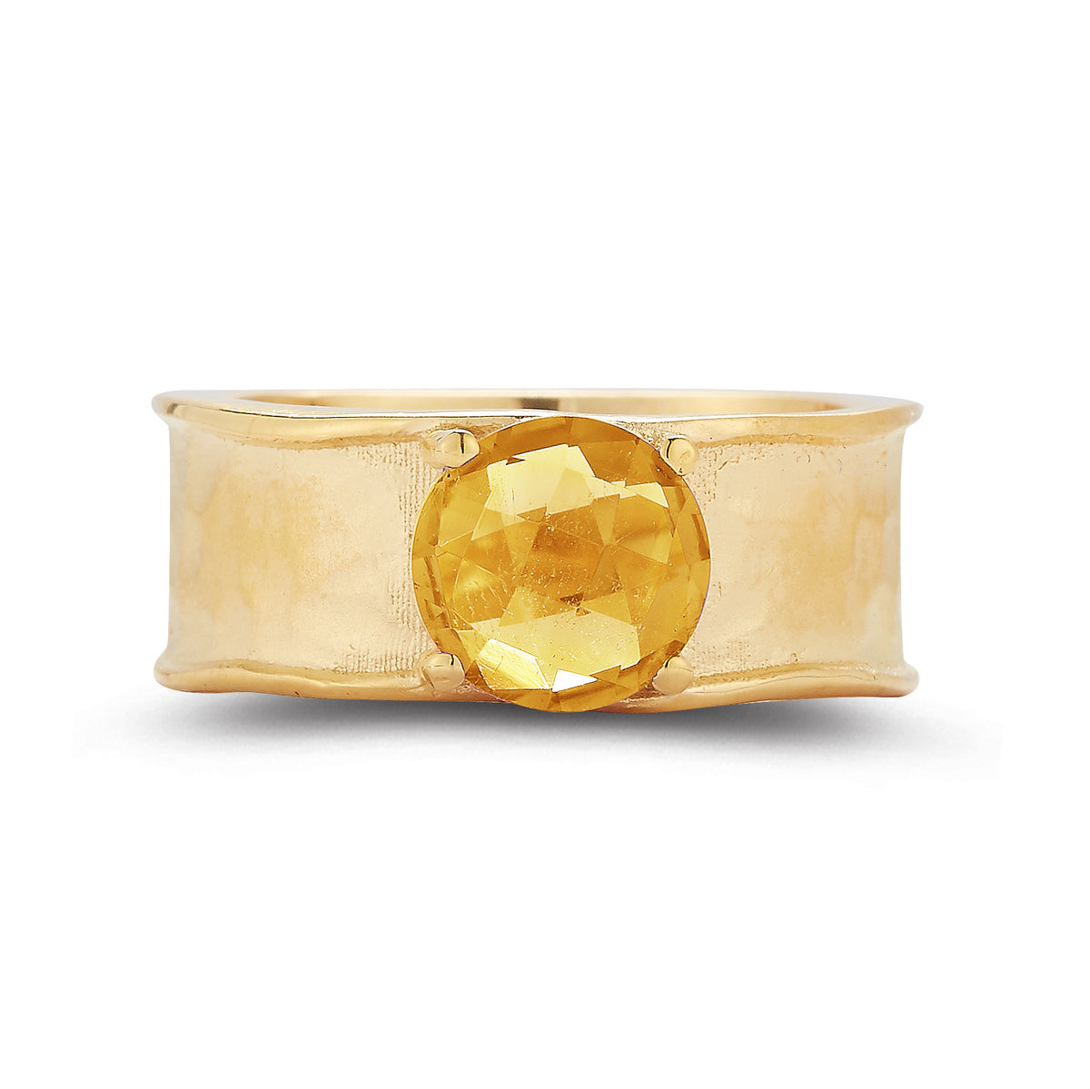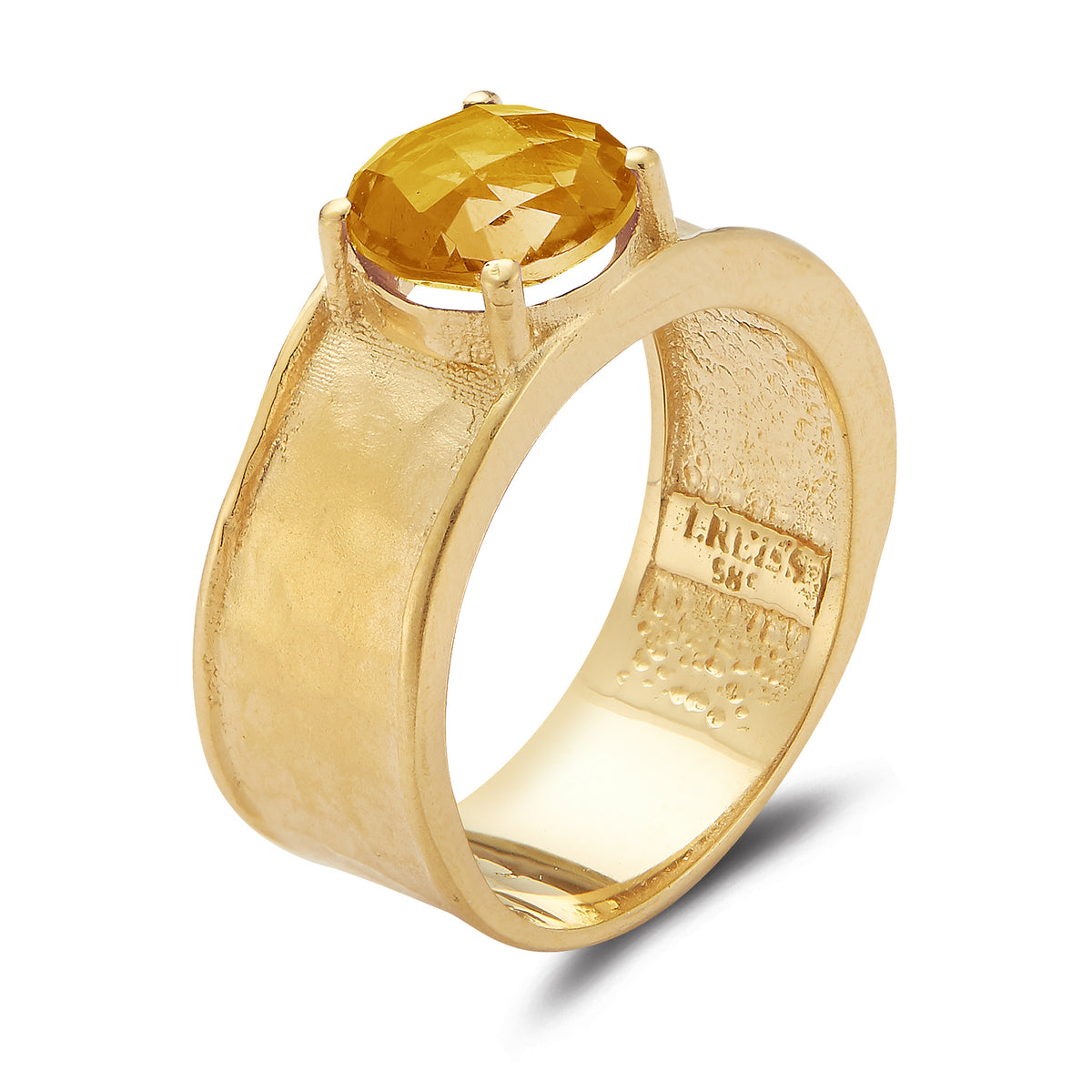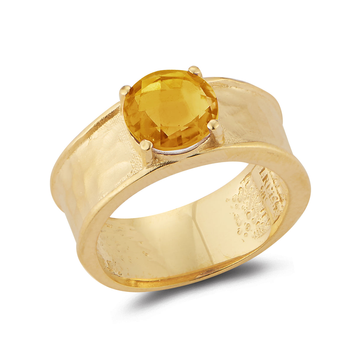 14k yellow gold matte and hammer-finished cocktail ring, centered with an 8mm round checkerboard-cut 1.8ct citrine semi-precious color stone