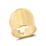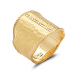 14 karat yellow gold matte and hammer-finished scallop edged cuff ring accented with 0 10 carats of burnish set diamonds