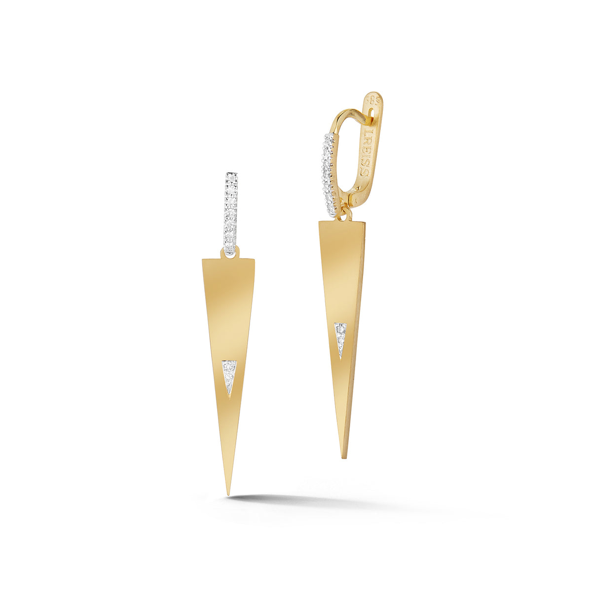 14 karat yellow gold polish-finished dangling triangle earrings accented with 0.15 carat of pave set diamonds