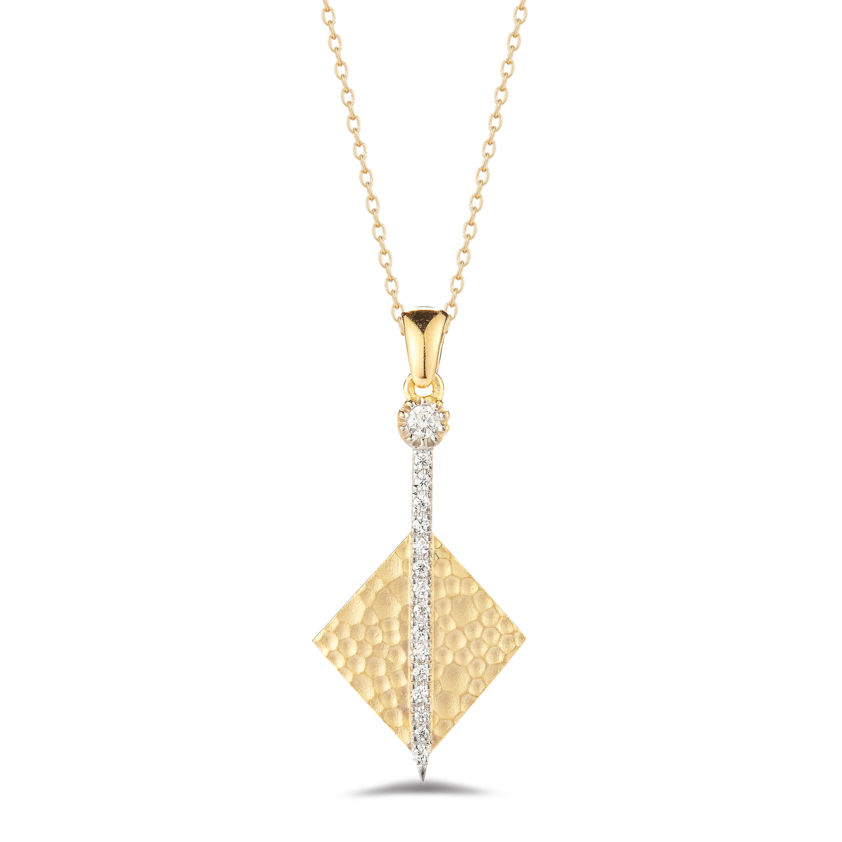 14 karat yellow gold matte and hammer-finished diamond-shaped pendant accented with 0 15 carats of pave set diamonds sliding on a 16 rolo chain