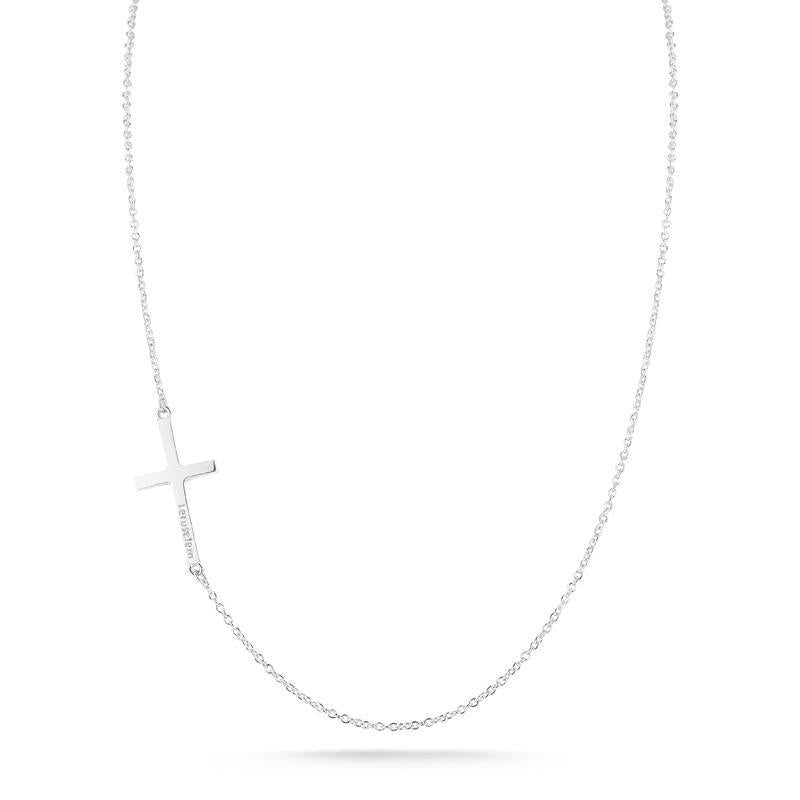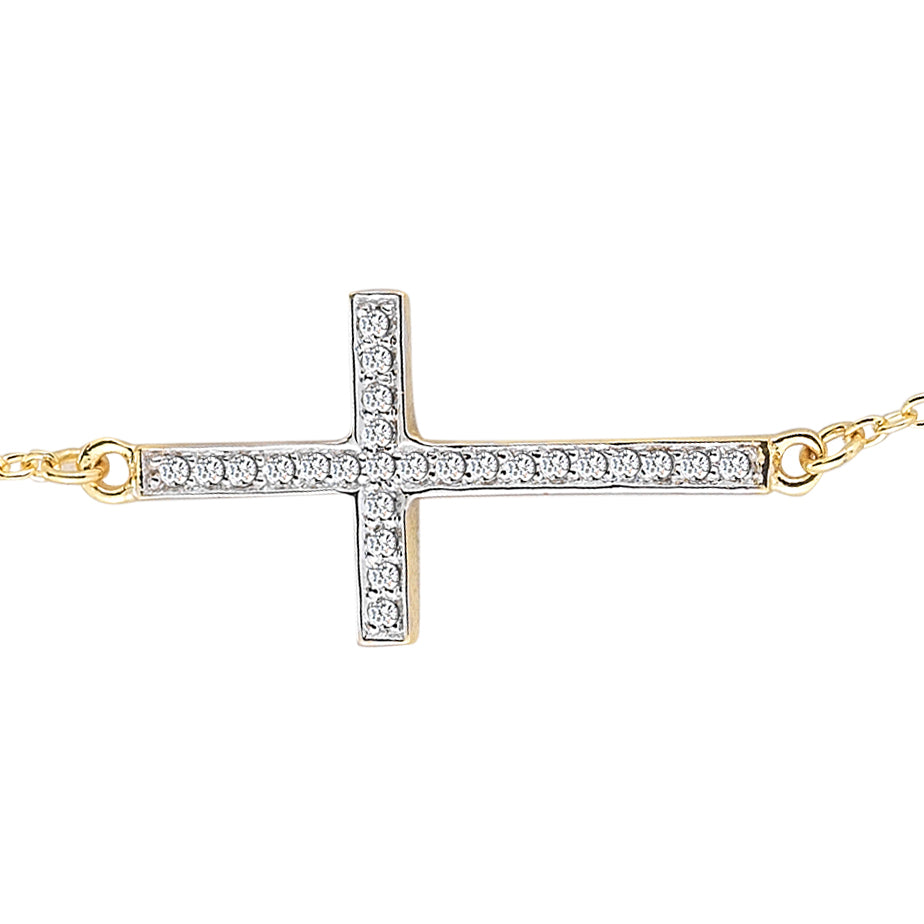 14 karat yellow gold polish-finish east-to-west cross necklace engraved with the jerusalem imprint on the back and accented with 0 25 carat of pave set diamonds