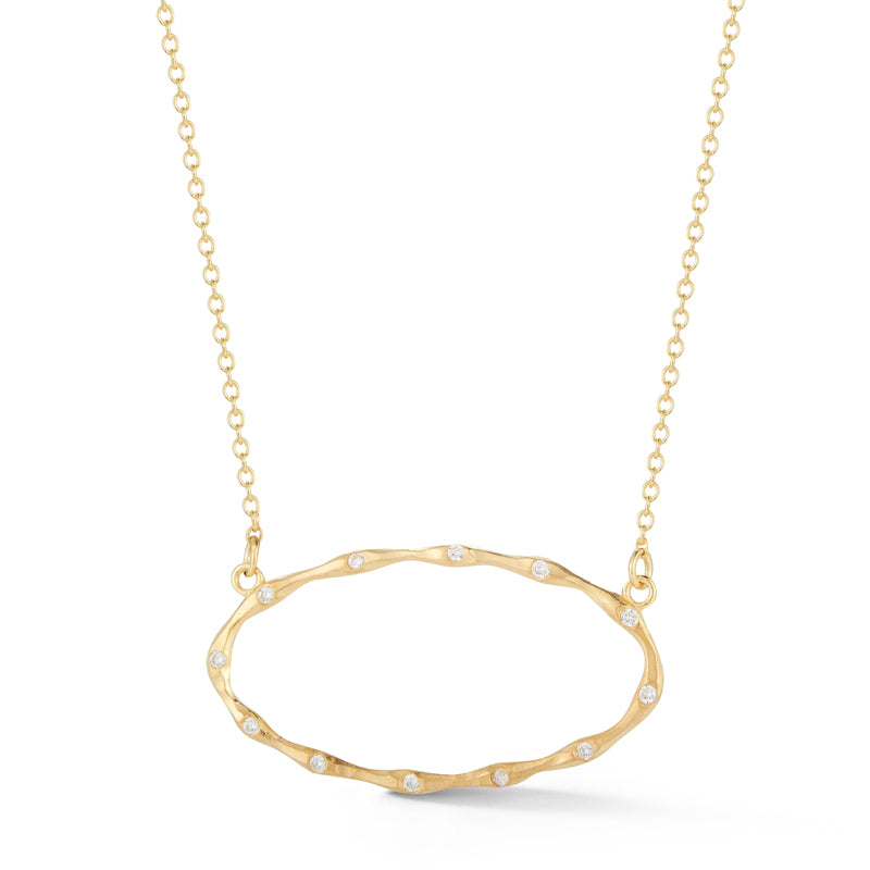 14 karat yellow gold matte-finished east-to-west open oval necklace accented with 0 25 carats of burnish set diamonds