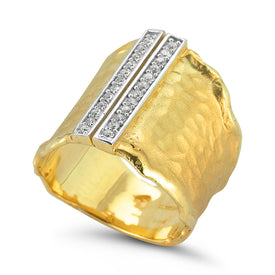 14 karat yellow gold matte and hammer-finish cuff ring accented with 0 15 carats of burnish set diamonds