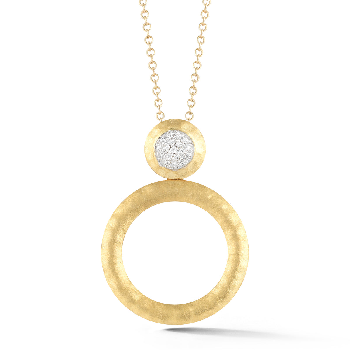 14 karat yellow gold matte and hammer-finish open pendant accented with 0 15 carats of a pave set diamond bail sliding on a 16 rolo chain