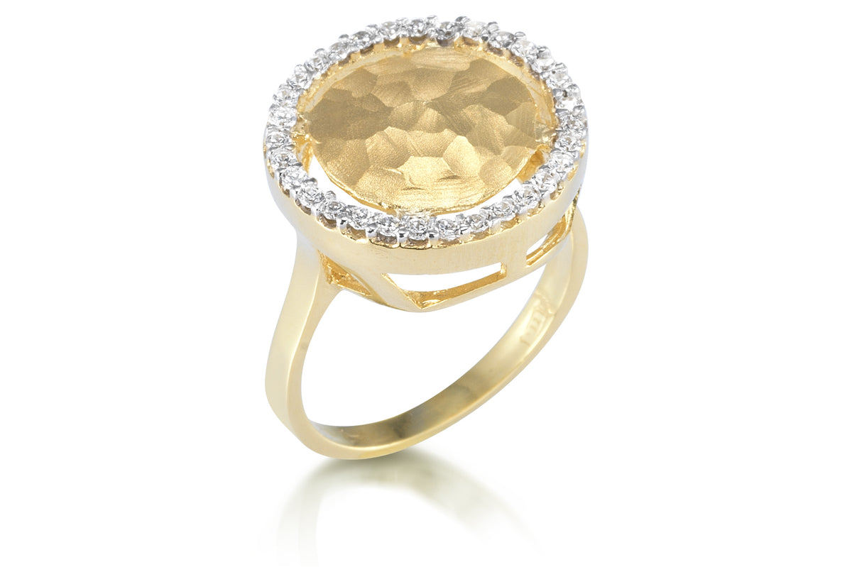 14 karat yellow gold matte-finish gallery ring centered with hammered-finish gold surrounded by 0 45 carat of pave set diamonds