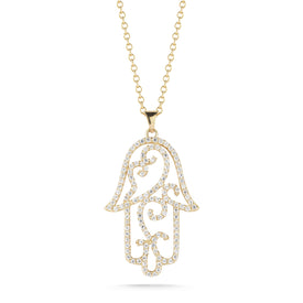 14 karat yellow gold hamsa pendant centered with a shema yisrael text surrounded by 0 50 carat of pave set diamonds