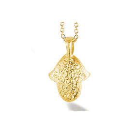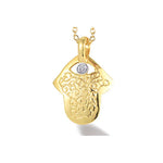 14 karat yellow gold polish finish etched hand of god chamsa pendant centered with 0 05 carat of a bezel set diamond 15hx12w mm