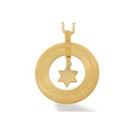 14 karat yellow gold polish-finish reversible hebrew and english lettering kabbalah pendant centered with a dangling 0 10 carat of a pave set diamond star of david 24mm in diameter
