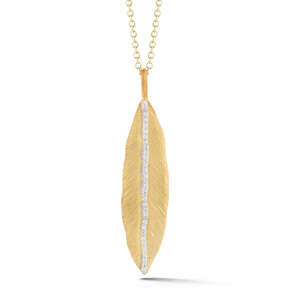 14 karat yellow gold matte and textured-finished leaf pendant accented with 0 20 carat of pave set diamonds sliding on a 16 rolo chain