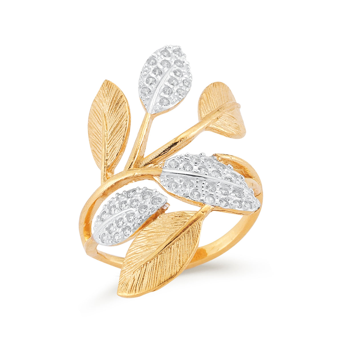 14 karat yellow gold matte and textured leaf ring accented with 0 30 carat of pave set diamond leaves