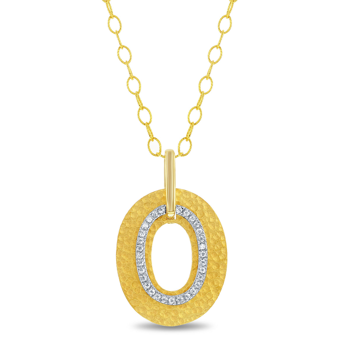 14 karat yellow gold matte and hammer-finished oval pendant, accented with 0.35 carats of pave set diamonds, sliding on a 16" rolo chain.