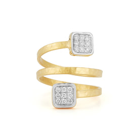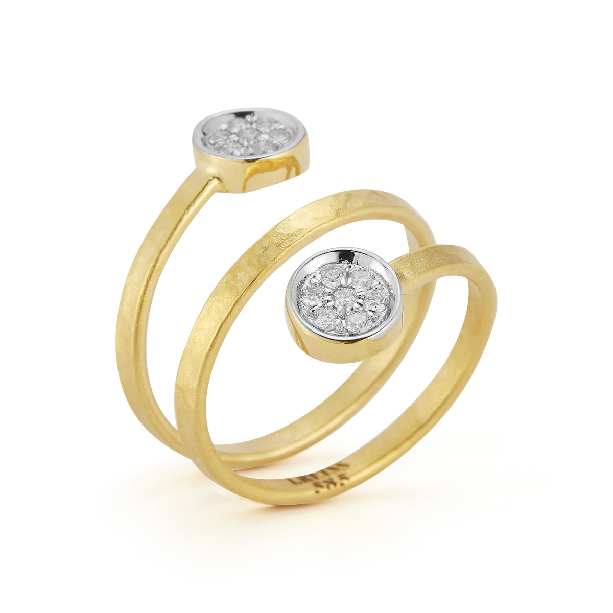 14 karat yellow gold matte and hammer-finished spiral ring set with 0 25 carats of pave set diamond circles