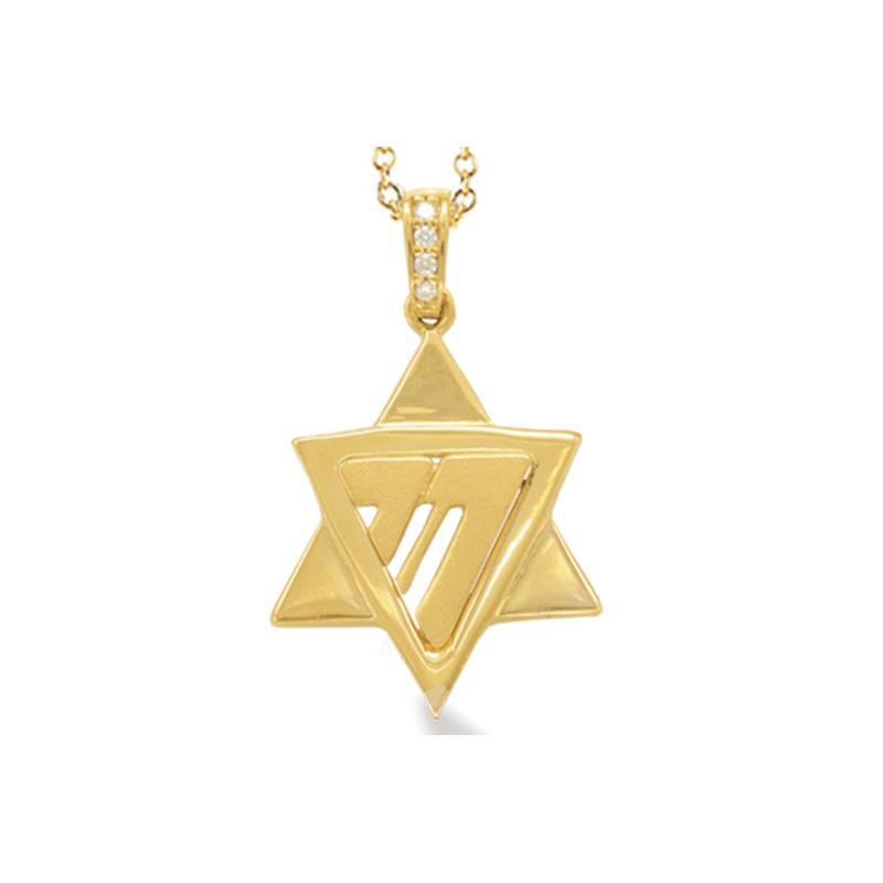 14 karat yellow gold matte and polish-finish star of david pendant centerd with a chai and enhanced with 0 05 carat of a pave set diamond bale 19mm