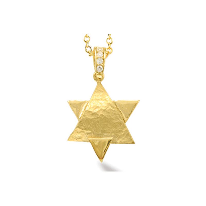 14 karat yellow gold polish and hammered finish star of david pendant accented with 0 05 carat of a pave set diamond bale 12mm in diameter