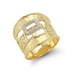 14 karat yellow gold matte and hammer-finished scallop-edged vitrage cuff ring accented with 0 15 carats of pave set diamonds